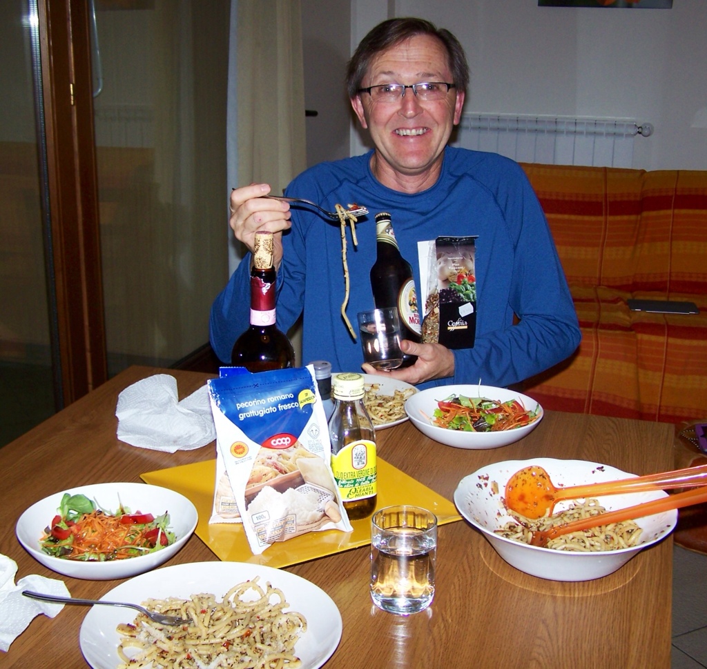After a few hours today of zig-zagging our way around central and southern Tuscany, we were walking along a wonderful narrow street in the amazing hilltop medieval town of San Gimignano. Shall we get something to take home for dinner? Yes! We bought some terrific pasta, Chianti wine, cheese, and flatbread. Now for the sauce. I chose some dried spices to mix with water and olive oil. The one with some chili sounded best. It was Sue's turn to cook.
