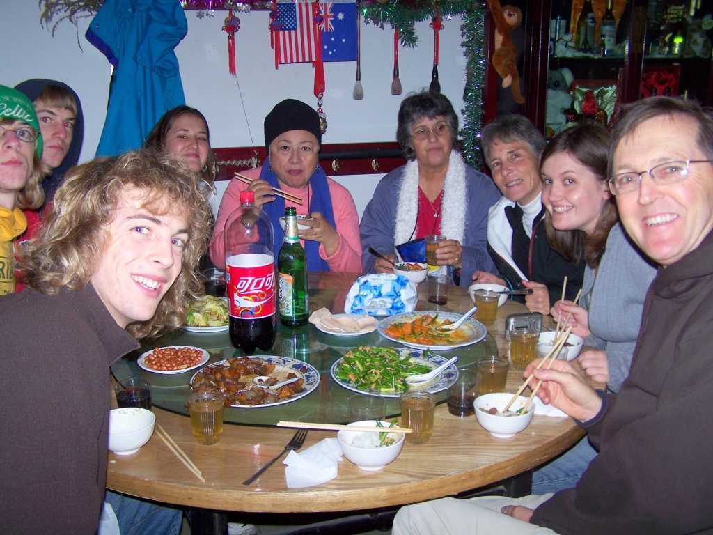 Our group, in photo at left, enjoys a tasty lunch in a Chinese family's courtyard home.