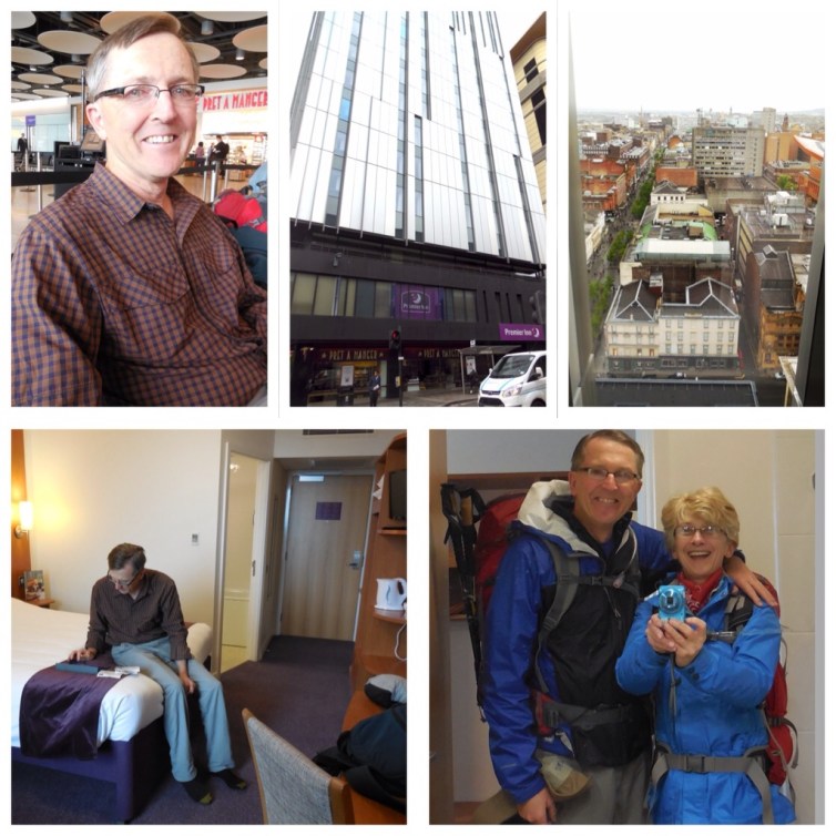 We arrived at our hotel, The Premier Inn in downtown Glasgow (top middle). Modern and clean, our 17th floor room provided a never ending view (top right and bottom left). Friday morning we were decked out and ready to hit the trail!