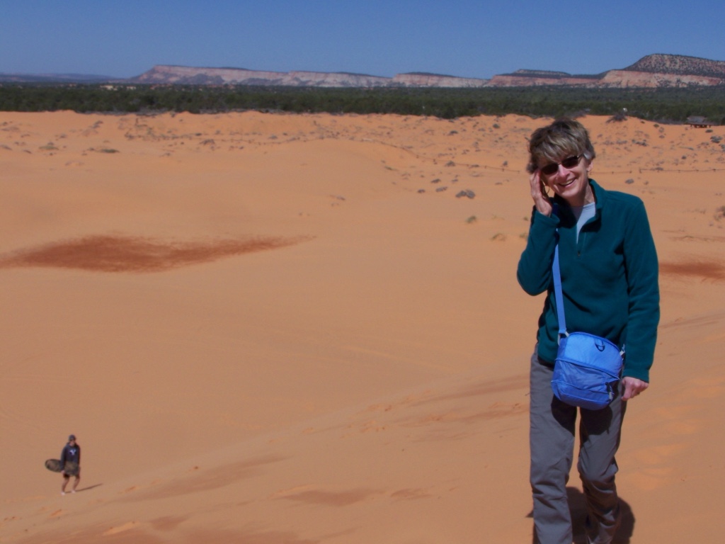 Reg and I hiked to the top — just to say we did — and that's where the bottom photo was taken. The wind was blowing like crazy. We had been warned to hang on to phones, wallets, earrings…anything of value that the monster dune might gobble up!