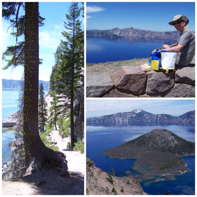 The Cleetwood Cove Trail is the only way to get down to the shore. Cloud cap Overlook provided a scenic lunch spot. Wizard Island is the larger of two islands in Crater Lake.
