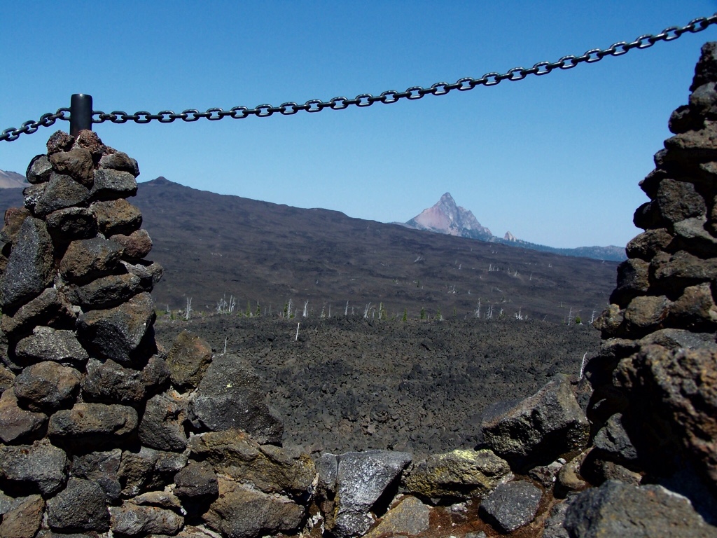 Mount Washington rises above more than 50 miles of lava beds. Travelers built a wagon road through the rock in 1877.