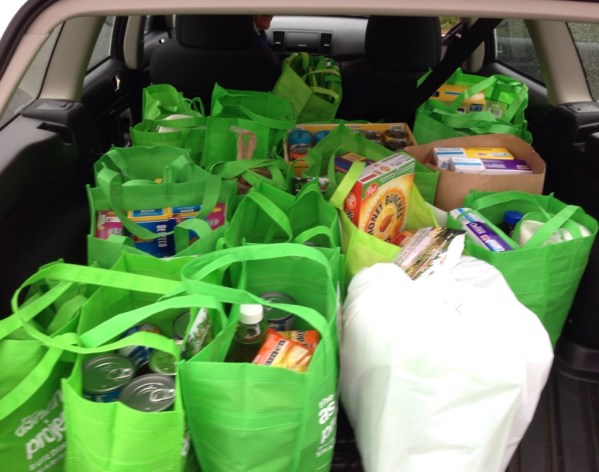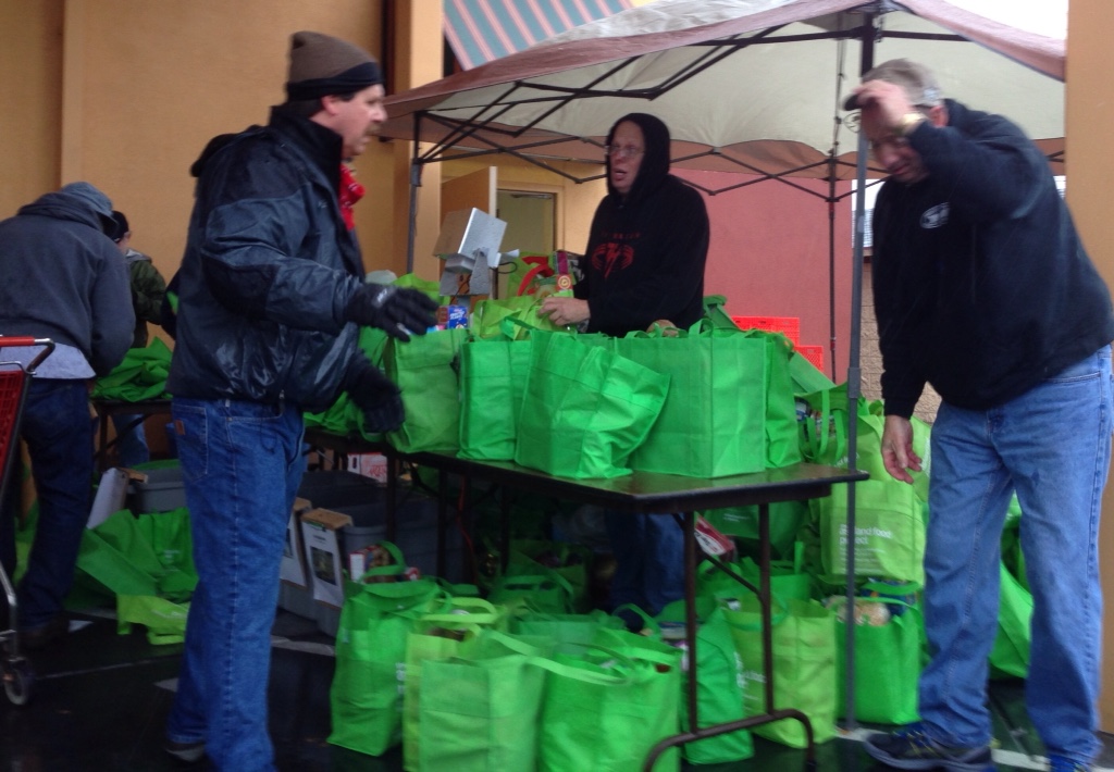 Green bags hold gifts of food and household goods for Ashland folks in need. Every other month, about 170 neighborhood leaders collect bags from homes all over town and take them to the Ashland Emergency Food Bank. We are hoping for 25,000 pounds today.
