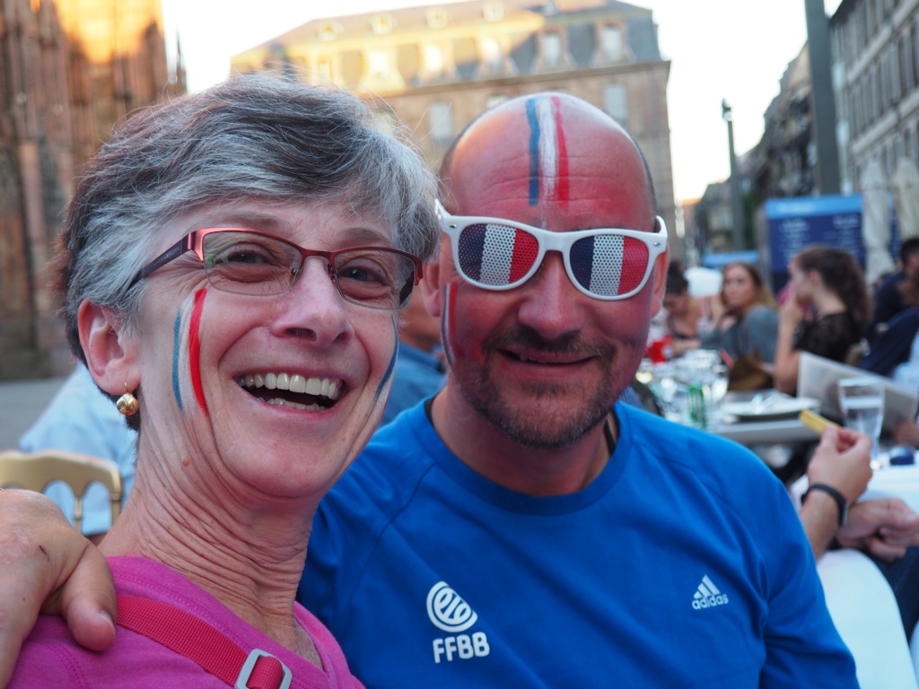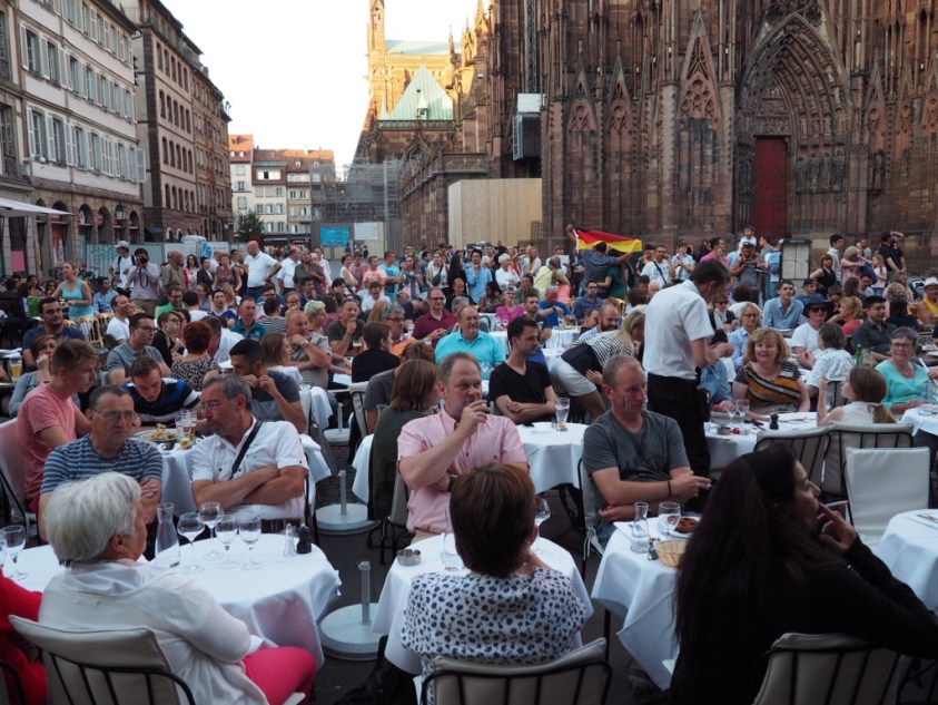 The France vs. Germany semi-final Euro Cup match was cause for celebration in Strasbourg tonight. Crowds gathered early, grabbing good seats in the few cafes with outdoor TV screens.