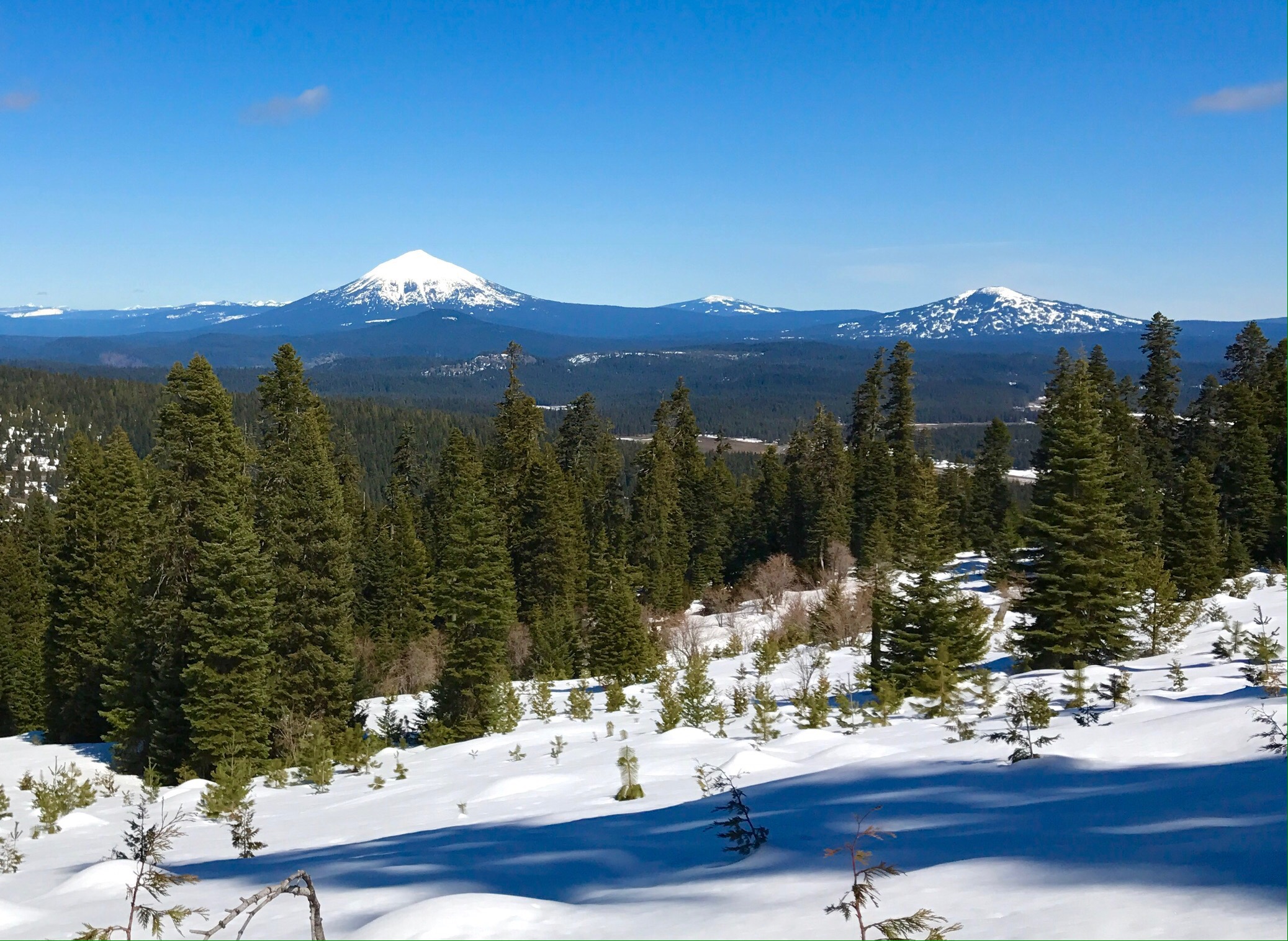 Another day of sunshine provided us with a beautiful end to our disappointingly short snowshoe season. Unusually cold winter temperatures and my poorly timed broken wrist caused a late start this year. Never mind…our trek today along the Natasha’s Web loop trail at Buck Prairie Winter Recreation Area was well worth the wait. The trail and clear skies rewarded us with an amazing distant view of 9,495 foot Mount McLoughlin as we headed uphill.