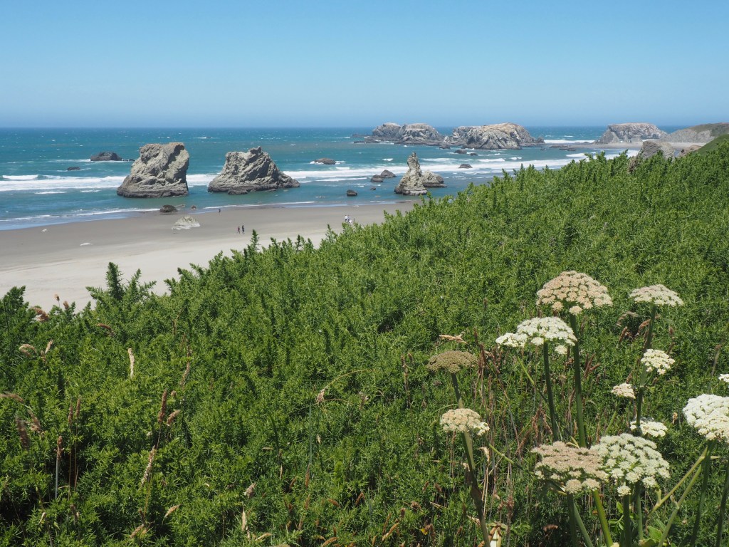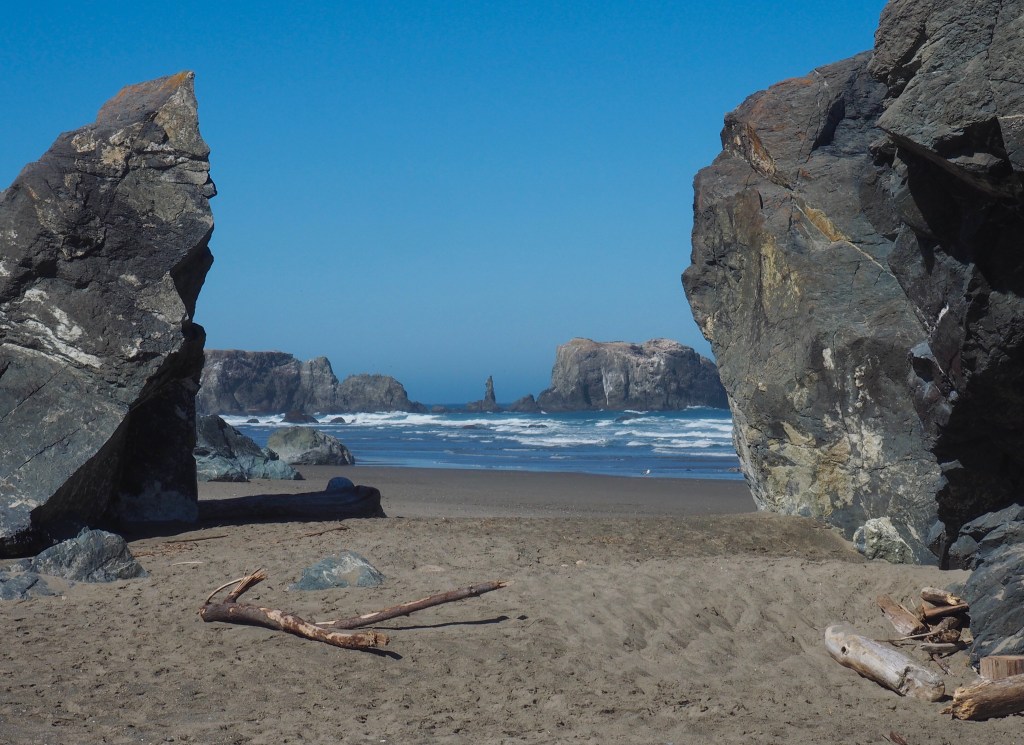 The wind continued to blow, as it has since we arrived on the coast, but without a cloud in the sky, it was a beautiful day to walk on the beach in Bandon, Oregon.