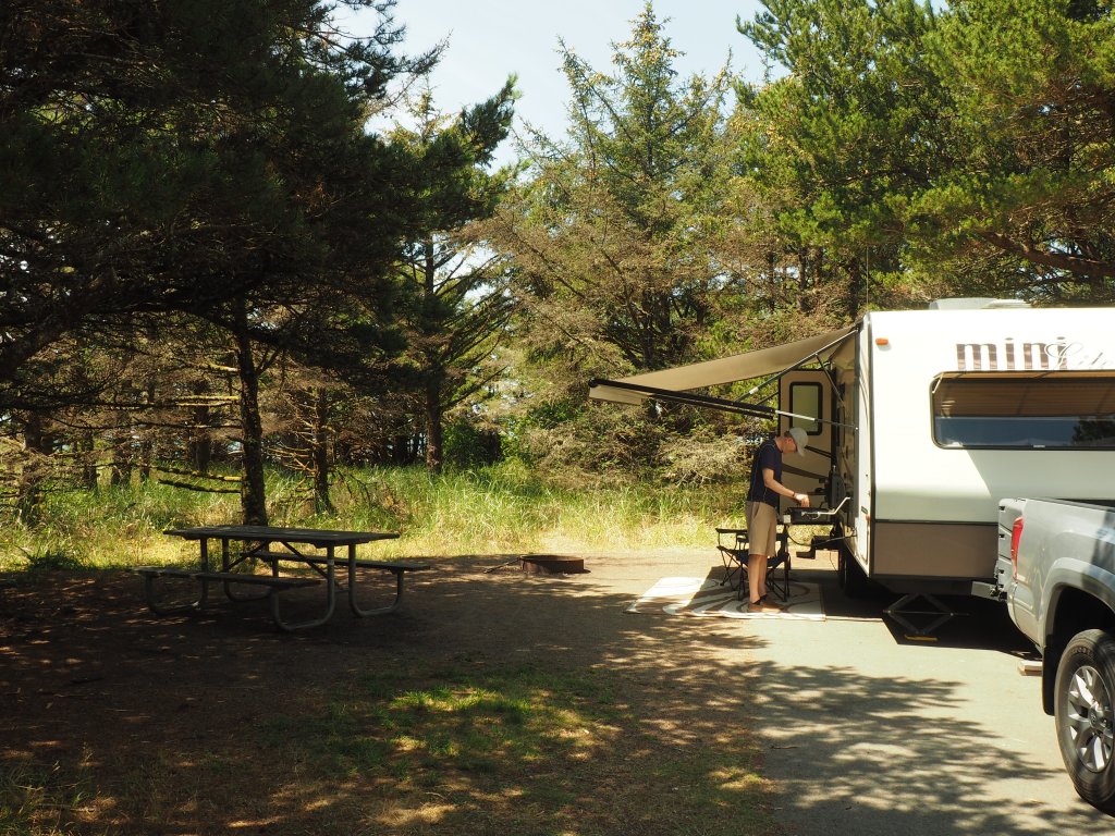 We enjoyed a long hike through Cape Disappointment State Park two years ago, so despite the gloomy name, we were enthusiastic about our 3-night stay. Our campsite was the best, (site A-9 if you’re taking notes) lots of open space backing up to a long stretch of sandy beach.