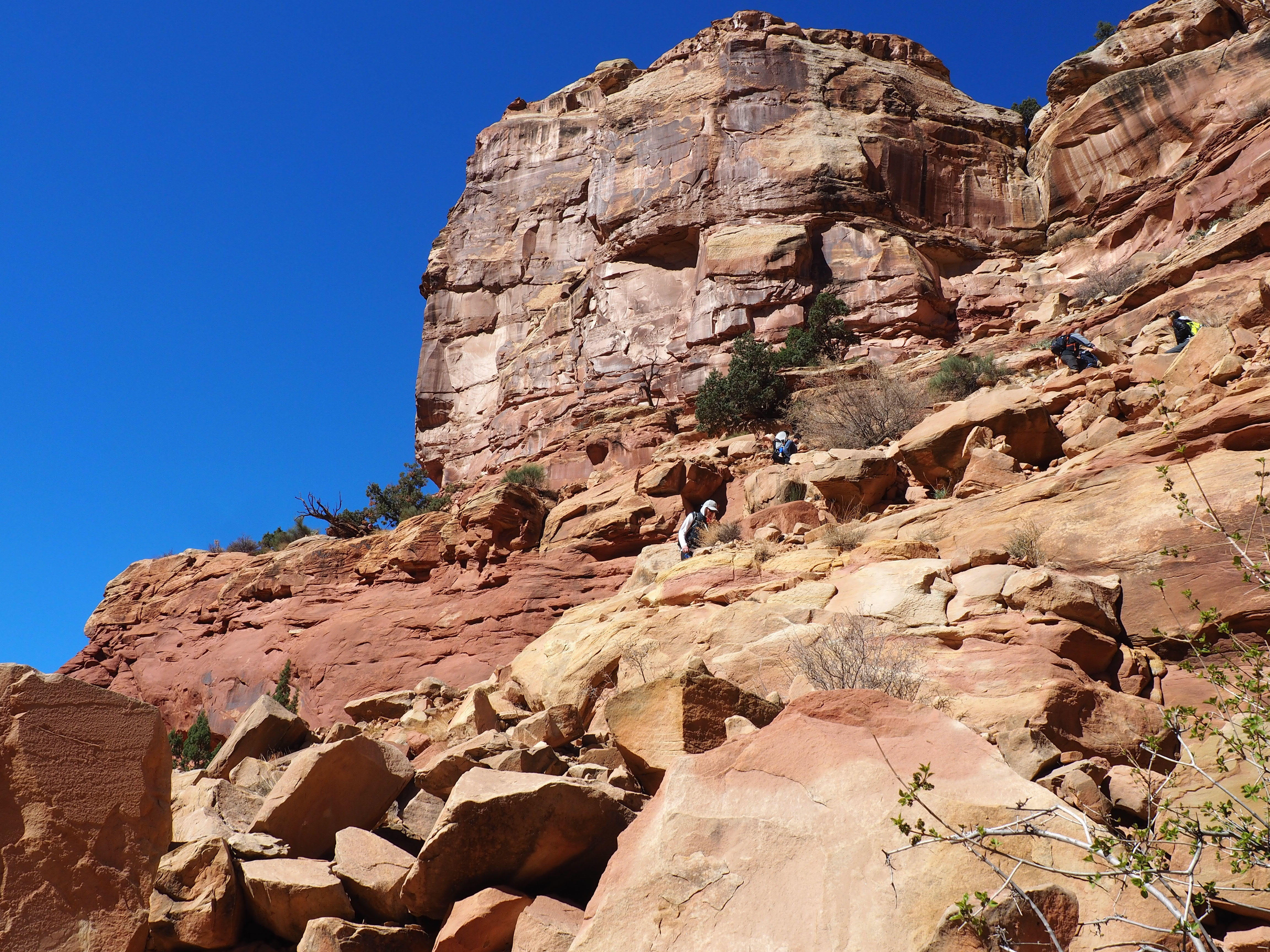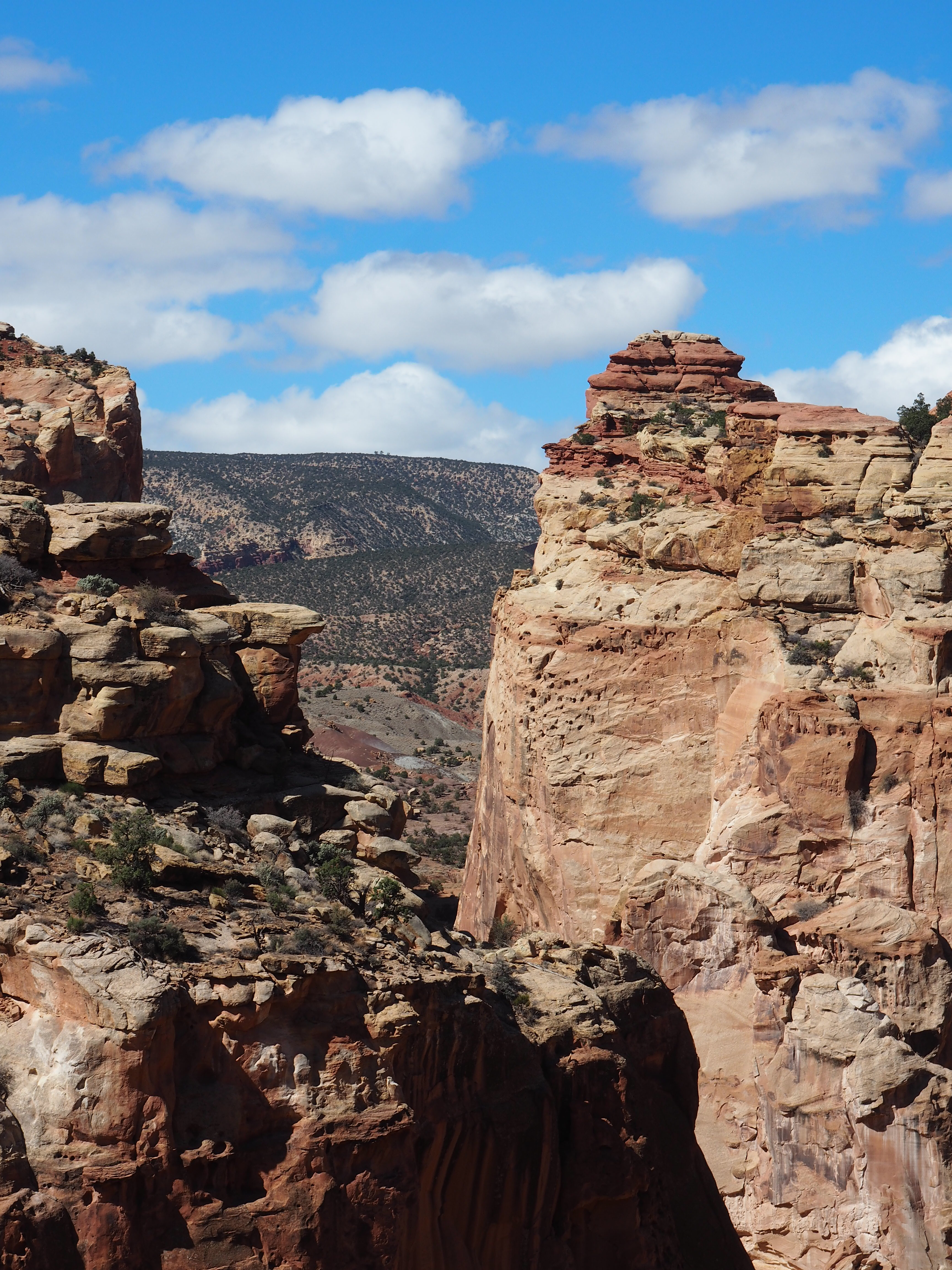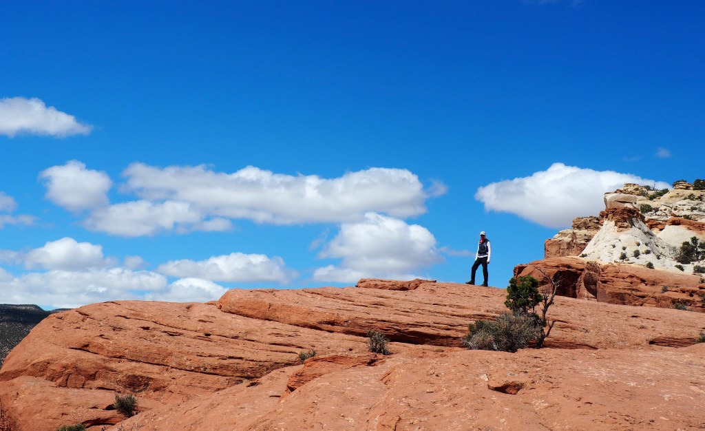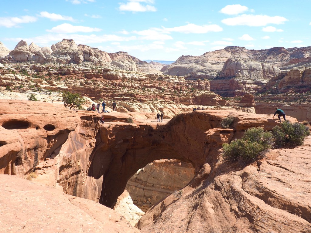 Today’s outing found us climbing up one of the more popular trails Capitol Reef National Park offers. It was Saturday (which we’d forgotten) and a free entry day (which we didn’t know about). We’ve been a little spoiled when it comes to share the trail with so many other folks, but the clumps of walkers eventually spread out and once we reached the top we realized it was all worth it.