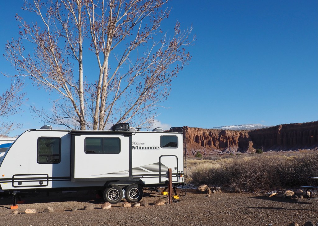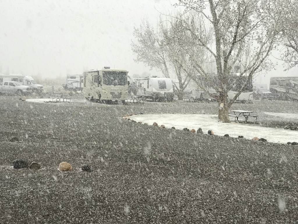 Lots of excitement on the road Friday. Reg did a great job of remaining calm and confident as he towed us 280 miles in and out of mild snow flurries. Arriving at our campsite, we quickly set up, climbed inside and blasted the heater as we watched the snowfall kick it up a notch. The sun returned at daybreak, highlighting the beautiful backdrop we’ll enjoy the the next few days.