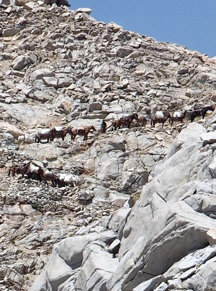 And then the mules caught up with us. Normally they were roped together in 3 groups led by Emma, Wyatt and Tate on horseback. Before starting up the pass, the mules were untied for safety. They are pretty sure-footed animals, but if one slipped on the narrow, steep switchbacks while tied together, they would fall like dominoes, scattering rocks and boulders on hikers below.
