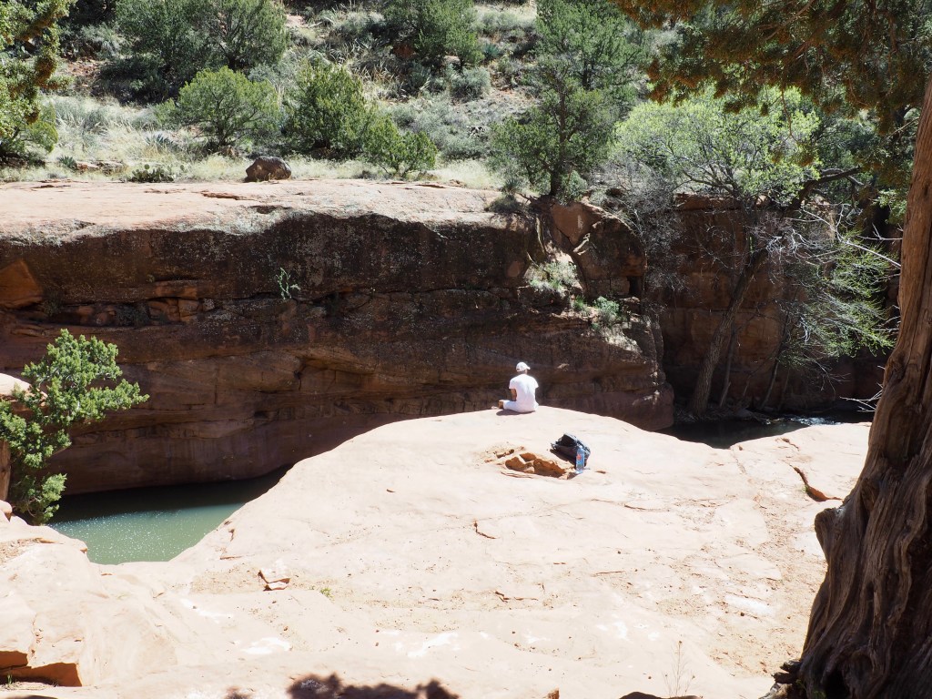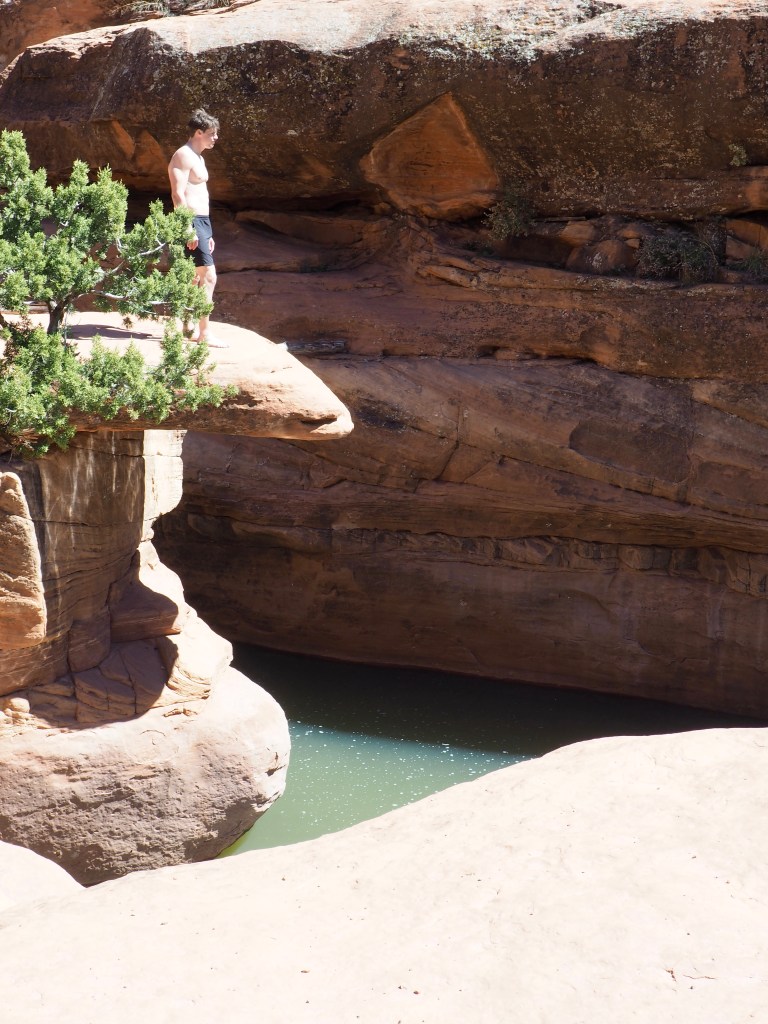 From our perch we could see the deep channel the creek cut between the rocky cliffs. What appeared to be a deep pool of water flowed between rapids both upstream and downstream, creating a tempting swimming hole after a long hot hike. We had heard that only the bravest jumped from the cliff, a plunge of about 20 feet.