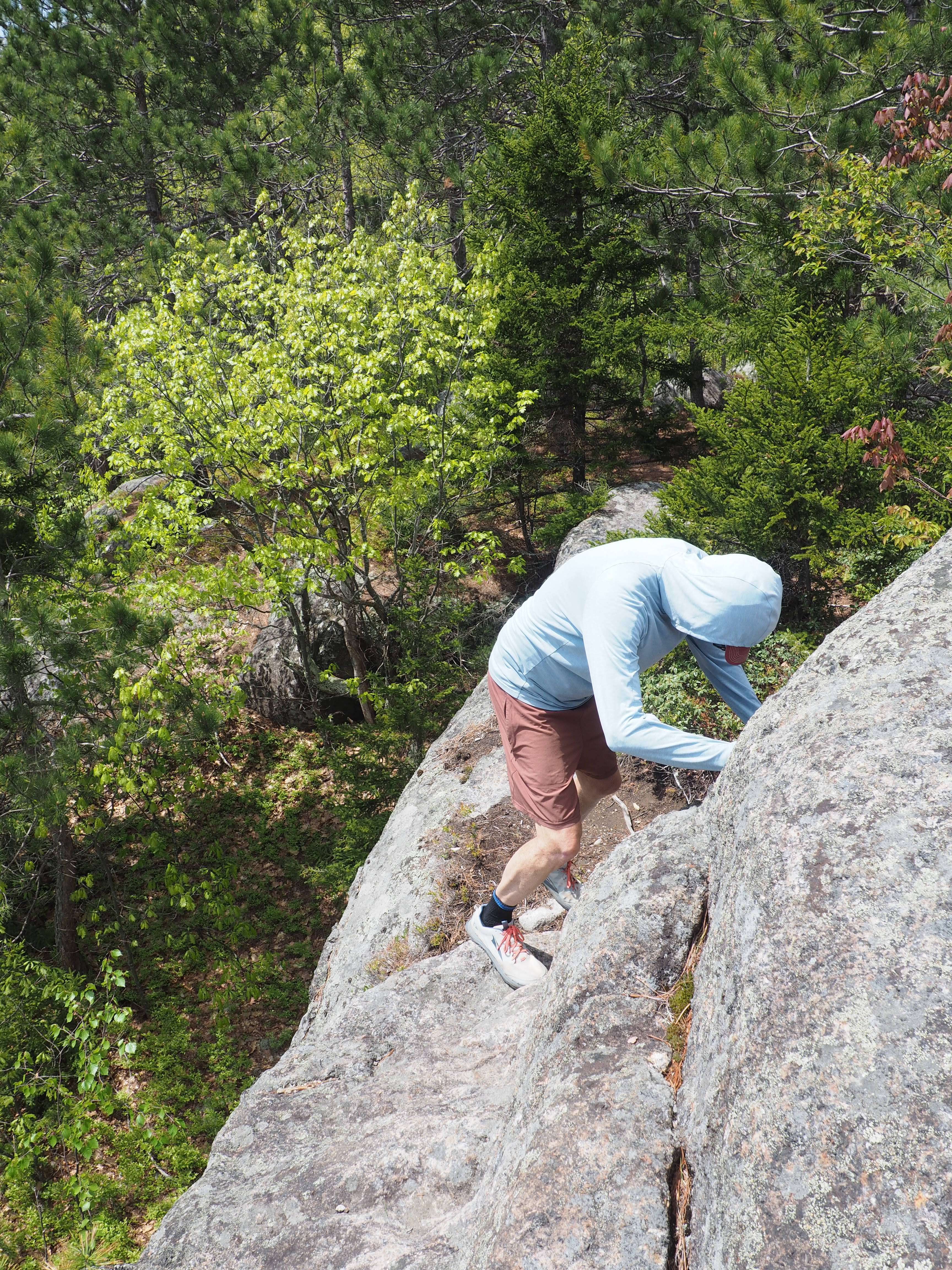 It’s been a long time since I’ve wanted to quit a trail as badly as I wanted to give up on this one. Impatient with the heat, humidity and swarming bugs, I struggled uphill behind Reg who kept calling back to me, “We’re almost there!” And then, finally we were. The view was every bit as good as promised. I snapped the photo of Reg as he carefully made his way back down off the knob. Fortunately, it wasn’t as scary as it looks.