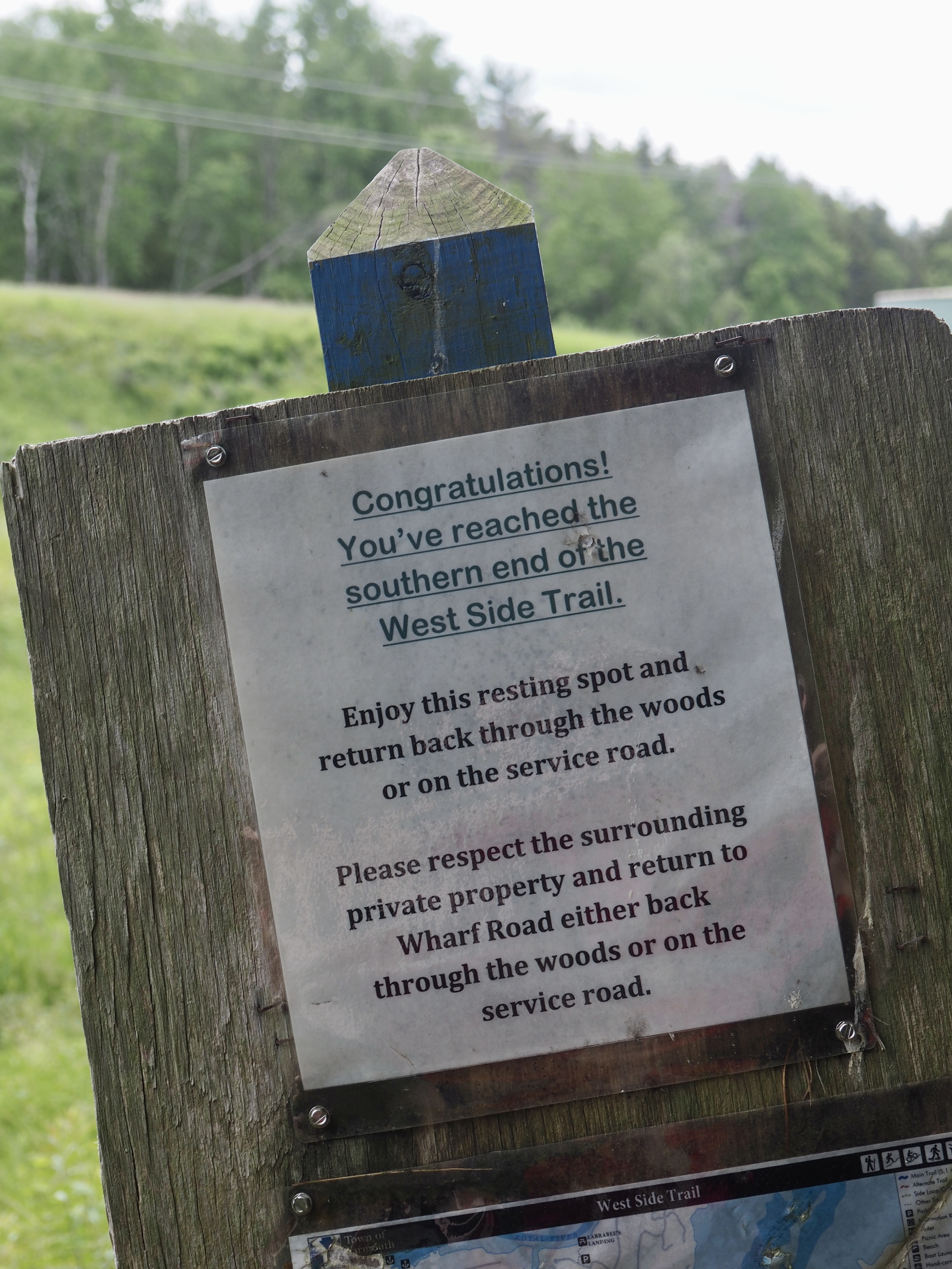 With the return of the sun, we took a chance on another island walk. A 7-mile portion of the West Side Trail took us by foot from Fels-Groves Farm Preserve, across the bridge over Casco Bay and a circle around Cousins Island. We hoped for an expansive ocean view at trail’s end, but once again our expectations were dashed. However, we enjoyed the walk and appreciated the bench (where we ate our lunch) and the congratulatory signpost at the end.