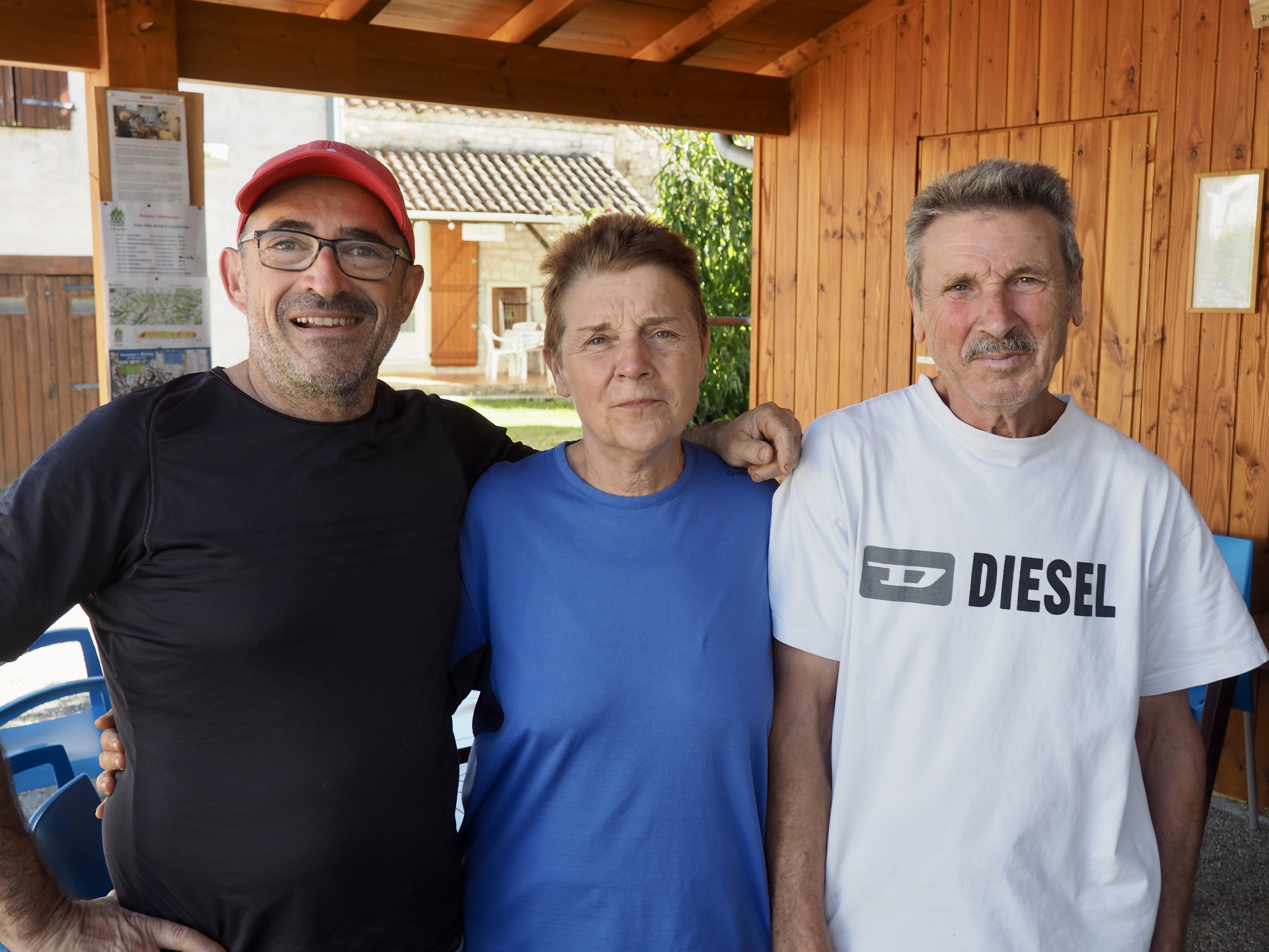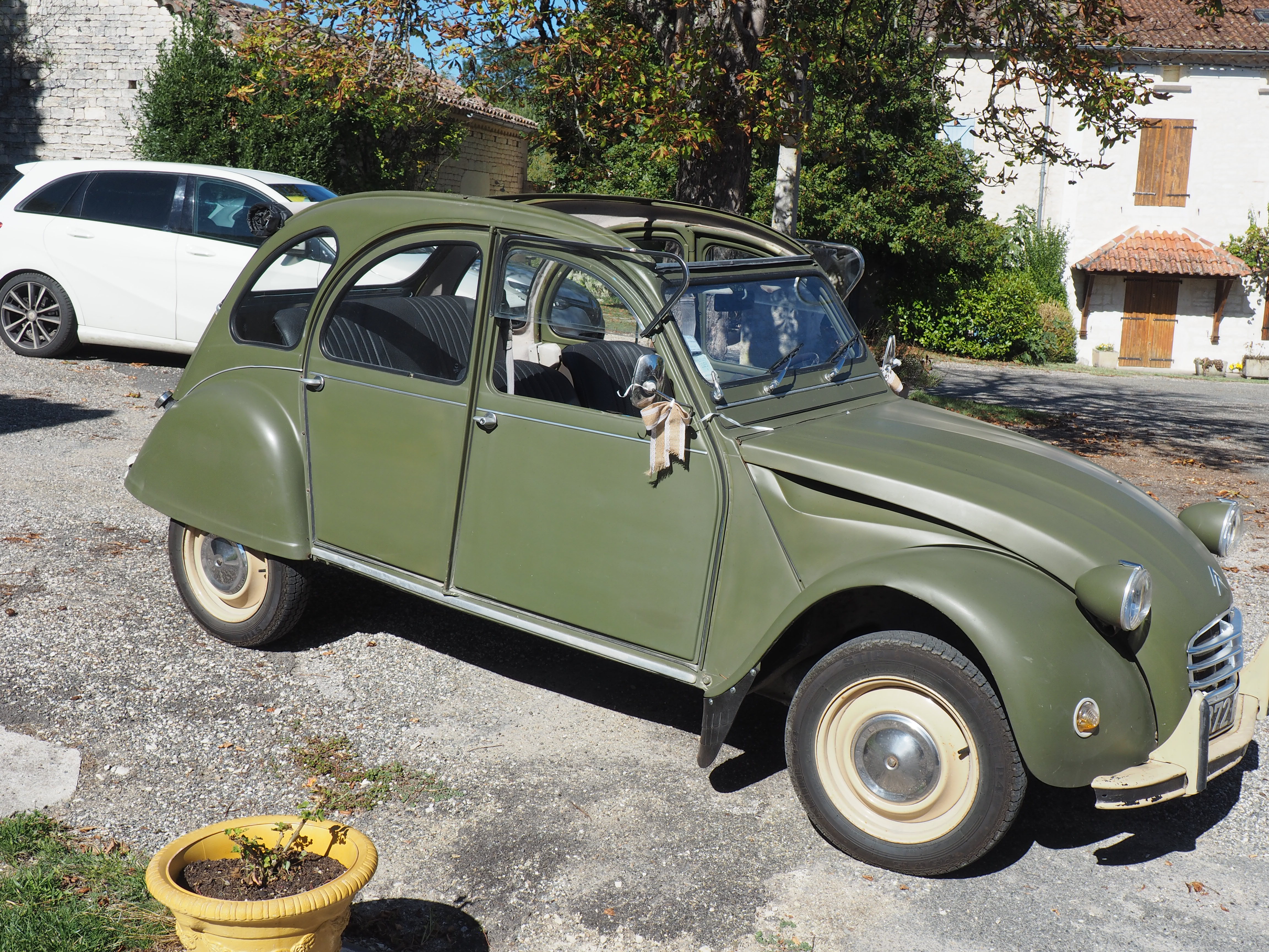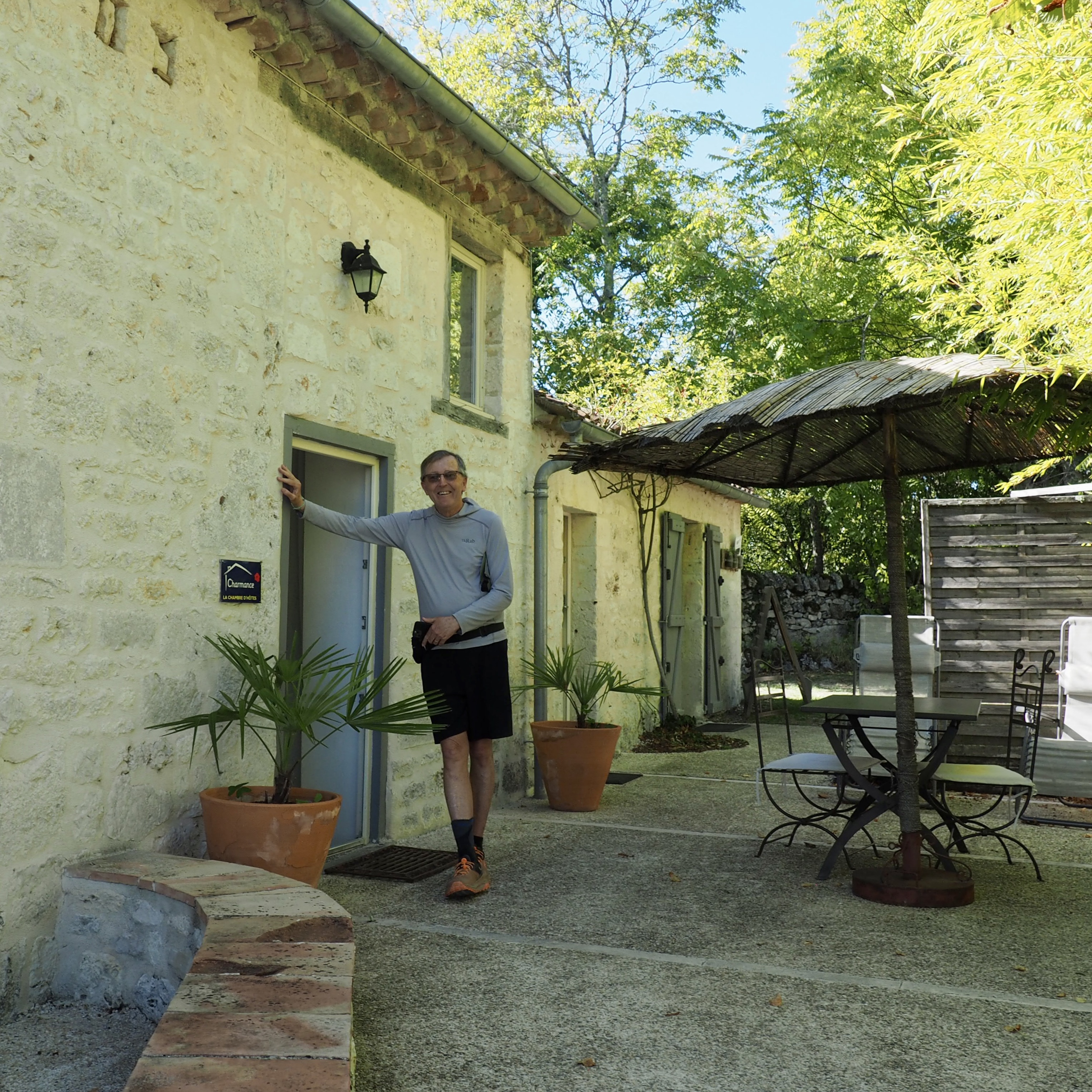 It was 3:00 and our lodging was still 2-1/2 miles away when we stopped for a cold drink at a trailside rest stop. We must have looked pathetic. The owner (above middle and her partner right) took pity on us and called our host to come pick us up. Our host David, on the left, showed up in that quintessential French car. He loaded us up and deposited us at his charming country compound. It was a wild ride!