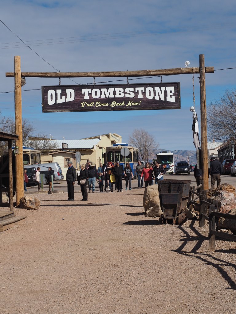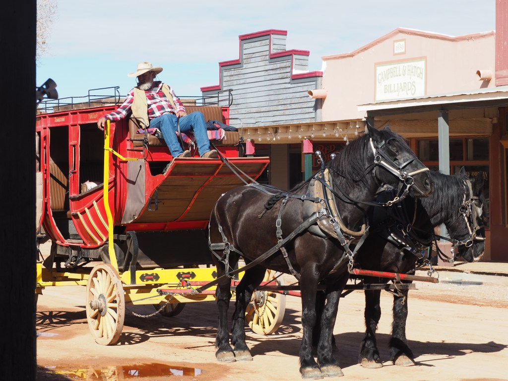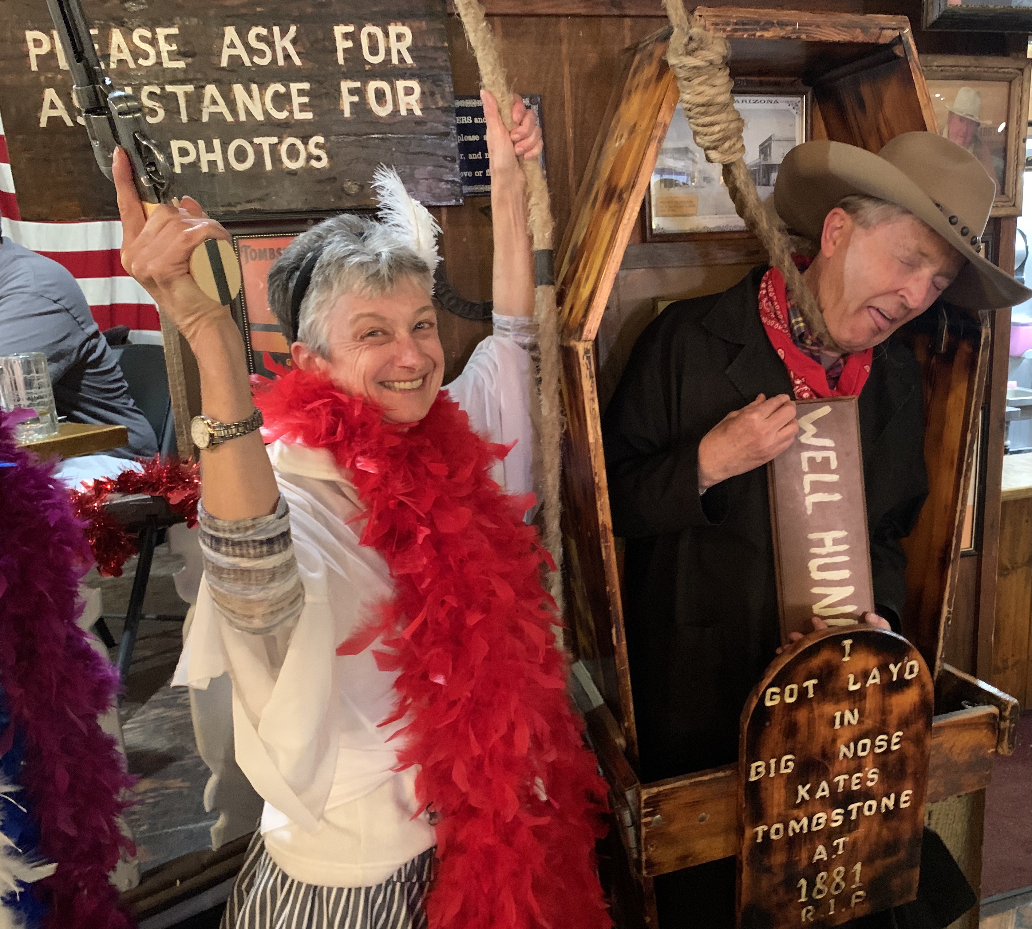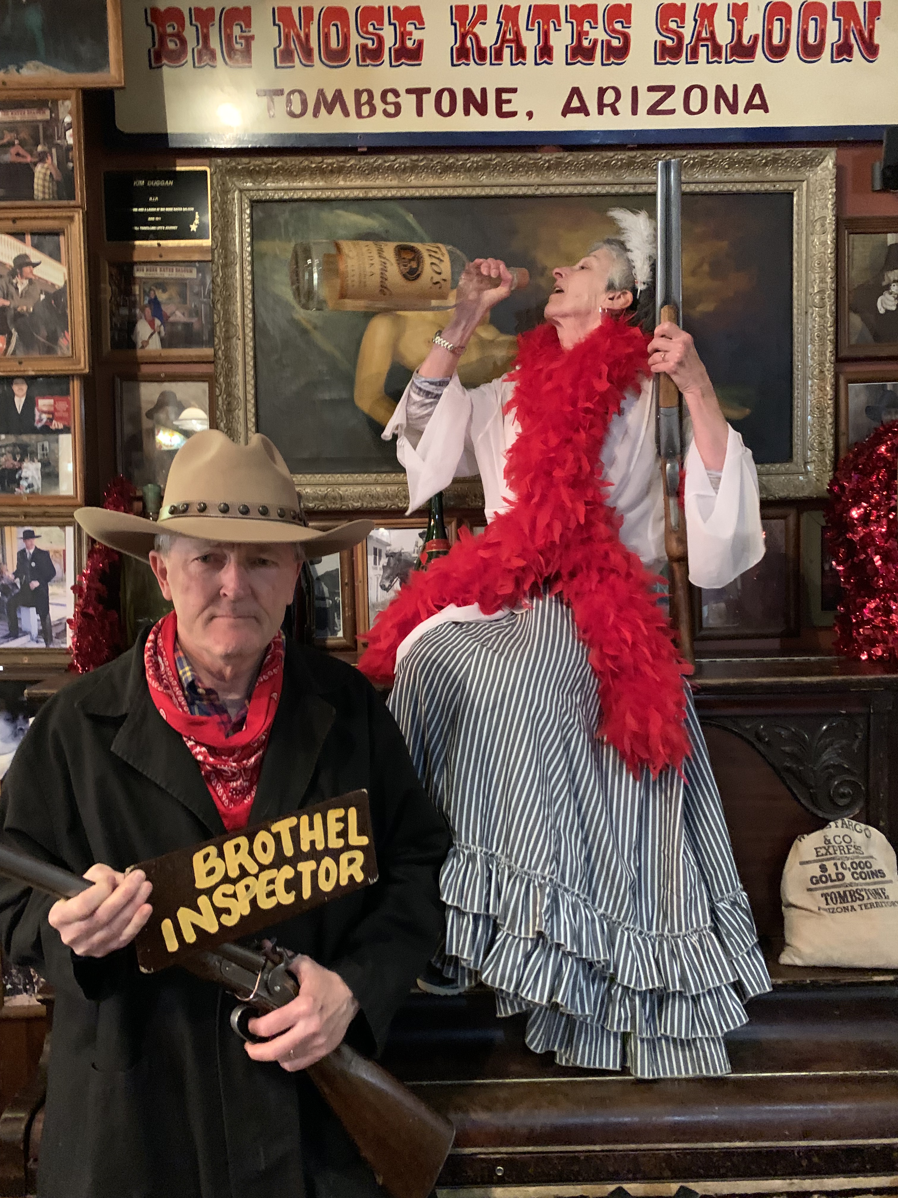 After eating our fill and tipping Mick we moved on to a little dress-up fun. The restaurant provides costumes and an extremely personable gentleman whose job it is to work the crowd, encouraging free-of-charge photo opportunities. How could we resist? I handed him my phone for photos and as diners watched, he dressed us, handed us rifles and posed us throughout the restaurant. All-in-all he took nearly 30 photos. Of course Reg tipped him well so I guess it wasn’t really free. But it was a whole lot of fun. If you visit Tombstone, don’t miss lunch at Big Nose Kate’s Saloon!