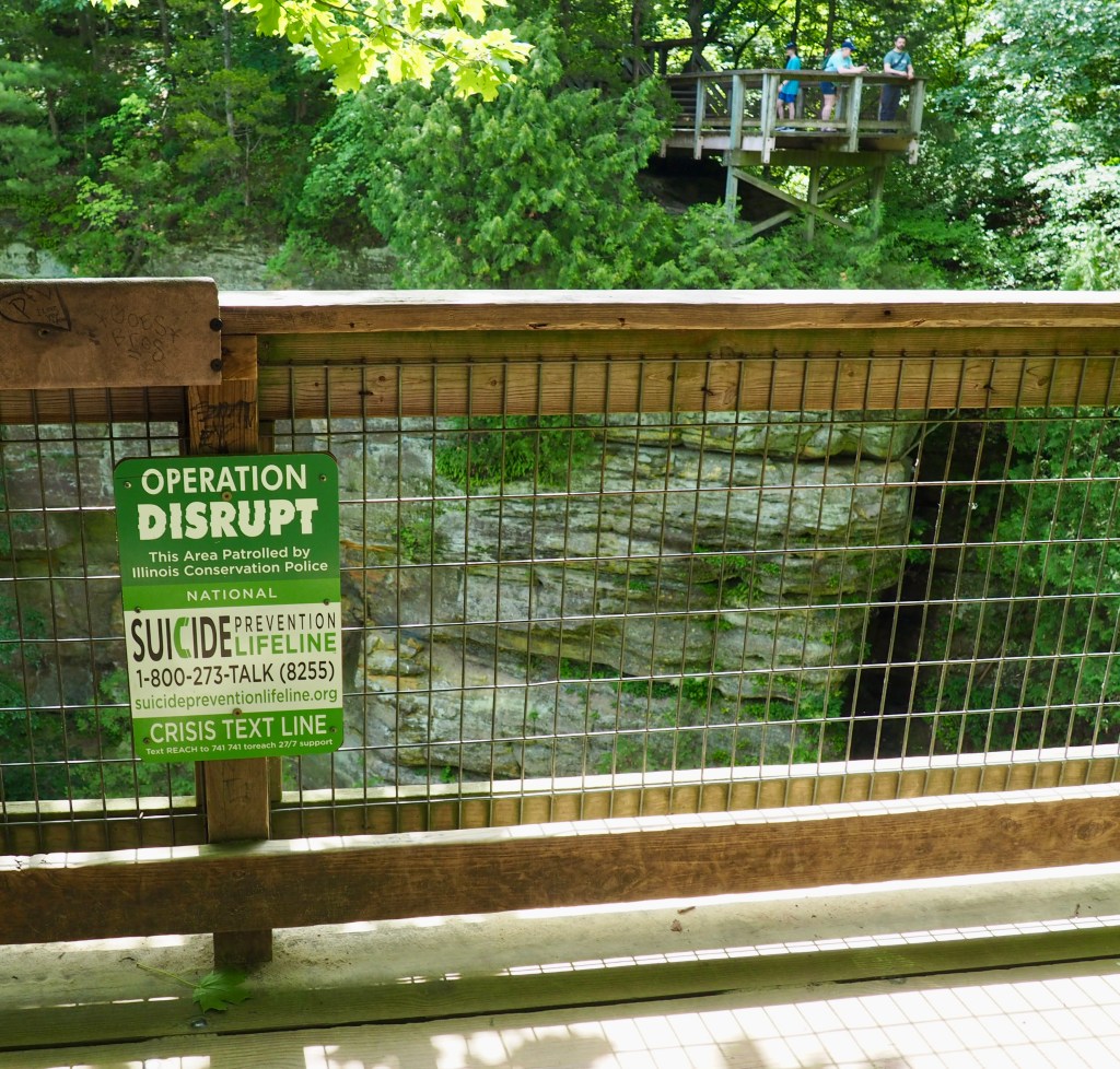 But there were much bigger outdoor curiosities to see in the area. We were blissfully unaware of the popularity of Starved Rock State Park when we pulled into the oversized parking lot. Crowds of day-trippers flocked to the visitors center, so many that Reg thought there must have been a special program offered.