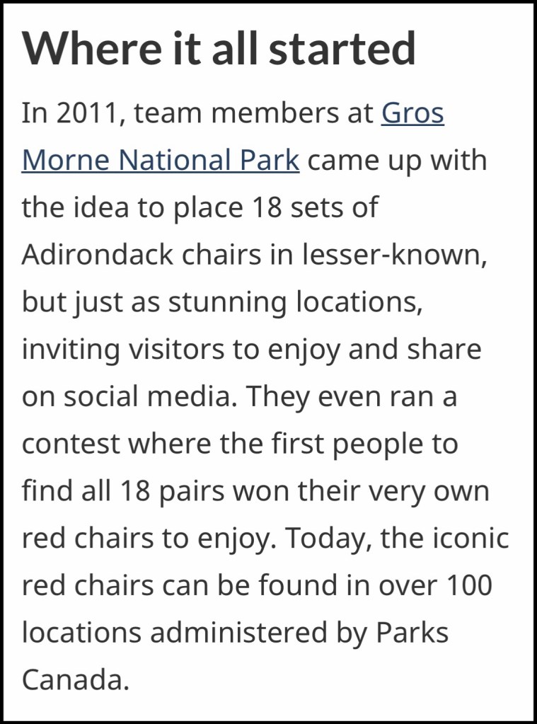 Eventually, curiosity got the better of Reg and with a little research he discovered where it all startedโฆat least we learned why so many chairs were scattered about Gros Morne National Park.