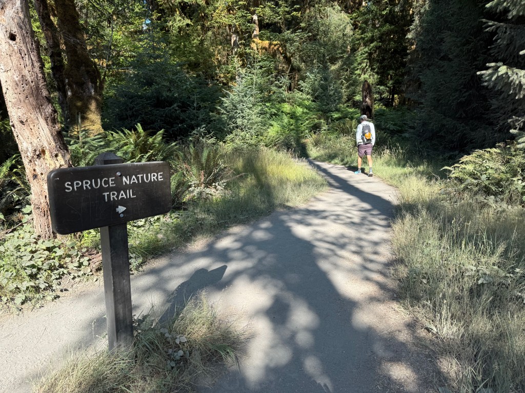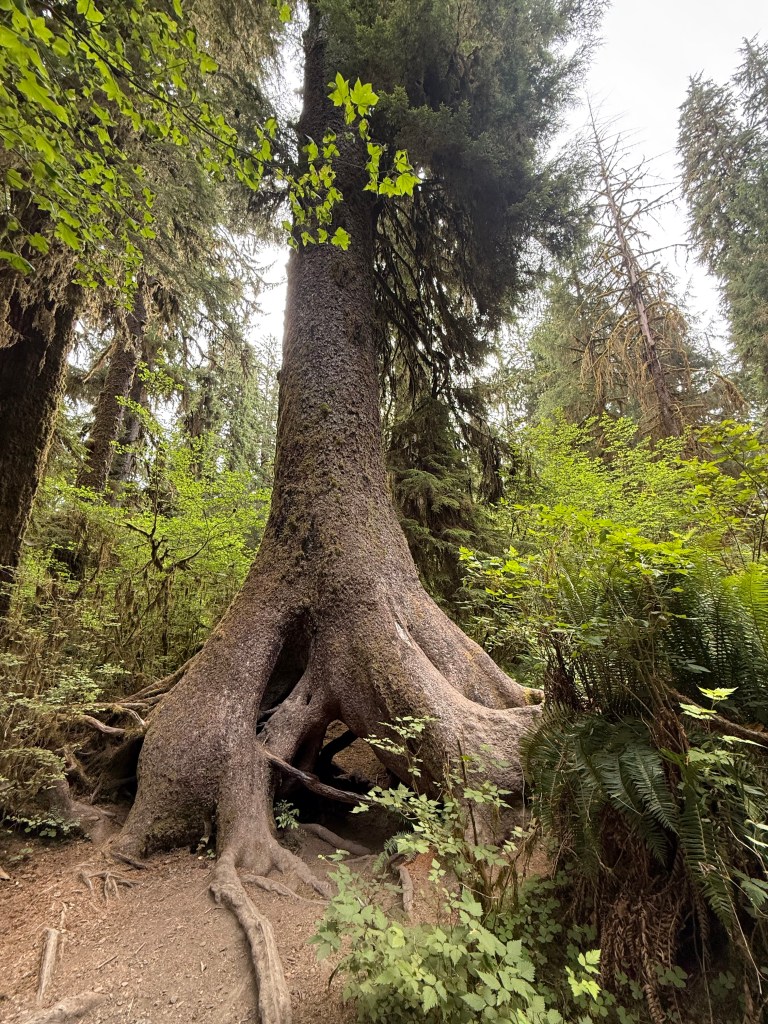 Next we tackled The Spruce Nature Trail, an easy 1.2 mile loop through the rainforest. We learned that the rain forest floor is so dense with vegetation that new trees have a difficult time growing a root system. Nurse logs, fallen trees that have begun to decay, provide nutrients and a platform for root systems allowing saplings to take hold. We saw multiple examples of this throughout the park.