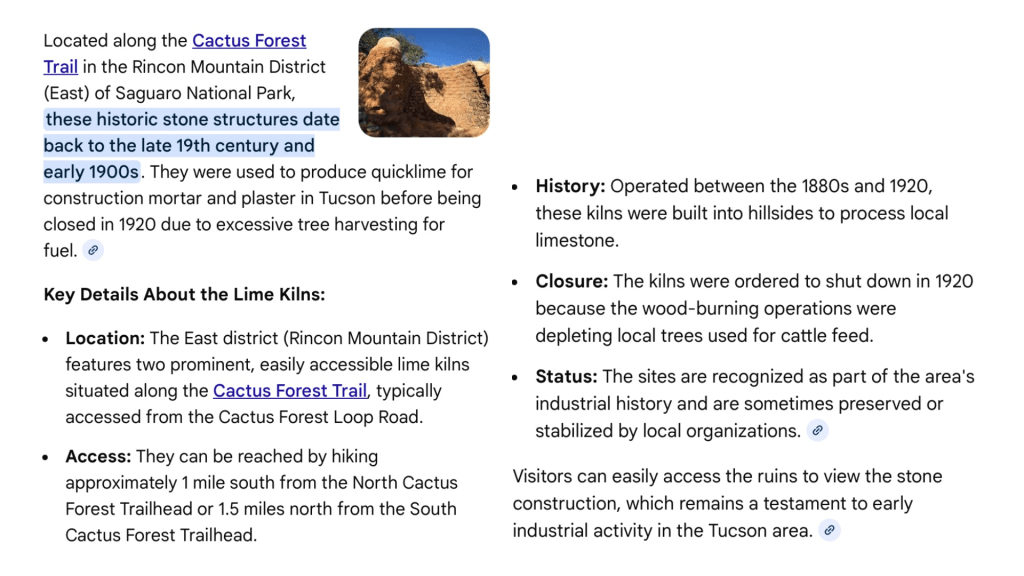 I cobbled together information from the Google AI source which explains the lime kilns far better than I could.