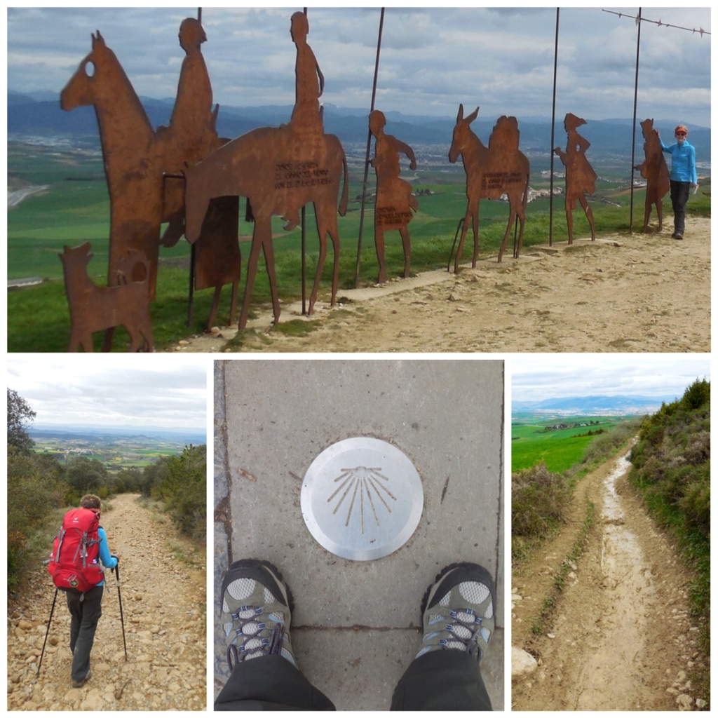 A bright day with sunny spells greeted us on our first day on the Camino Frances, although there was some slogging through the muddy remains of a wet spring. We started in Pamplona and climbed, often on a quite rocky trail, to the spectacular vantage point for Sue and her fellow trekkers above. Many signs in various forms, including in the sidewalk in Pamplona, guided our way. We found a small hostel and have met people from Denmark, Ireland, Australia, Brazil, Germany, and Florida over cafe con leche and, later, cervezas and wine. It is nearly time for our first pilgrim meal with the 20 or so staying here in Uterga. Just one day in and the Camino spirit is powerful.