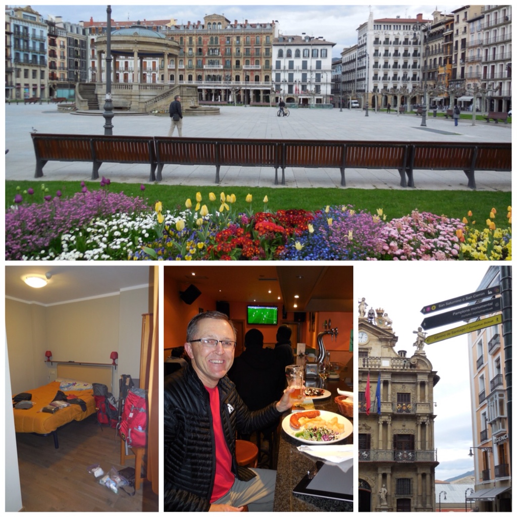Plaza del Castillo in the old town of Pamplona. Our room, simple but included a private bath with lots of hot water. Reg scored a great dinner. The sign post pointed us out of town. As much as we wanted to start in France from St Jean Pied-de-Port, weather reports warned that spring had not yet arrived in the Pyrenees. Snow was causing detours, so we made the decision to start from Pamplona, saving several days to enjoy when further along the trek.