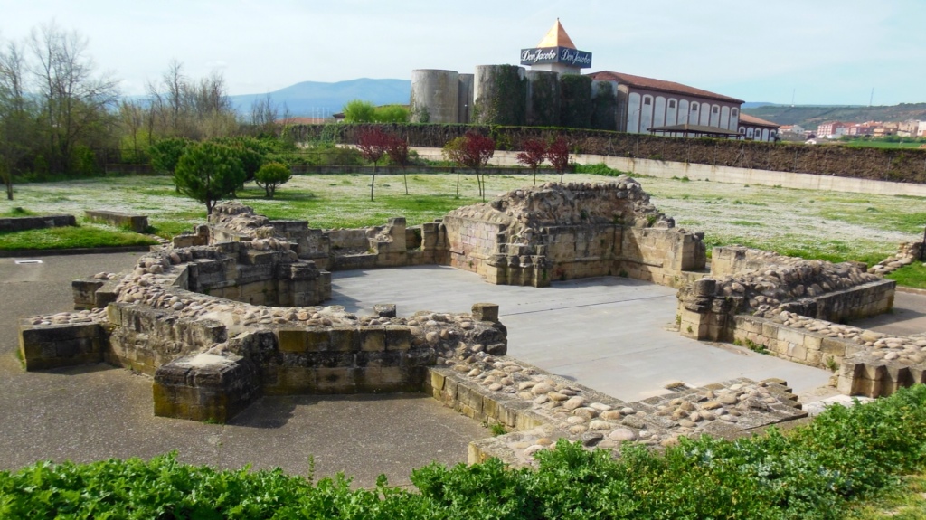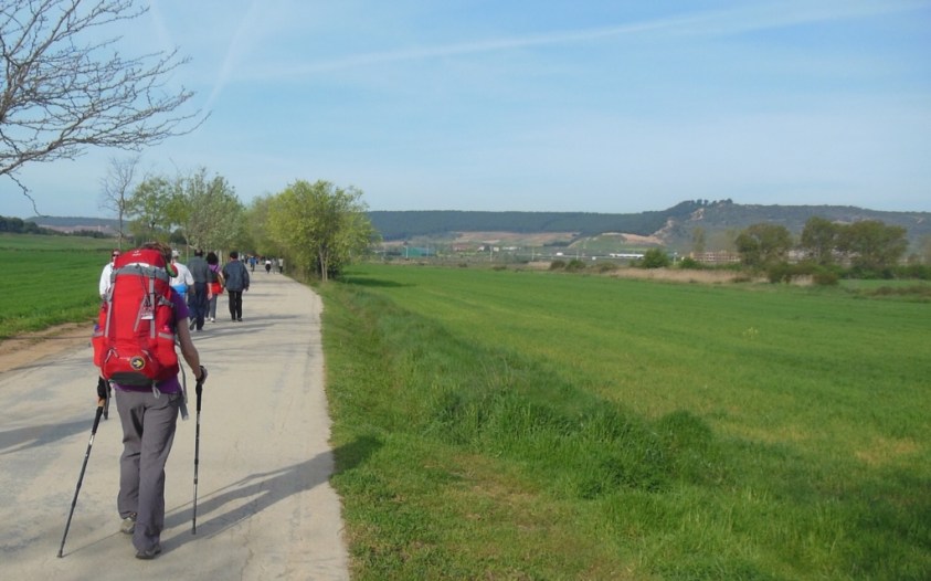 Below, the ruins of a 12th-century albergue and pilgrim hospital border the Camino, which doubles as an exercise path for locals outside Logrono.