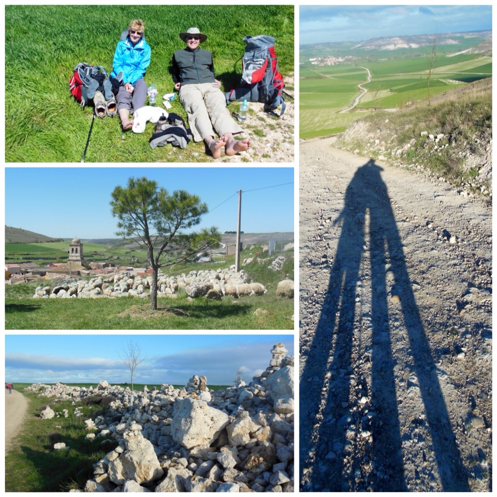 Removing shoes during rest stops is a life saver. Yes, that's my ankle that's held together with Velcro…the remnants of a sprained ankle last January…so far, so good. At the end of the day, tired feet are a given! Sore knees, ankles and shoulders are common complaints, and blisters have ended many a journey after only a few days. We began our day today (April 18) after walking 19 miles yesterday! Our longest day yet, and of course, the warmest day. That brought our total mileage to 101 in eight days. We staggered into the town of Santo Domingo De Calzada last night hot and tired. Reg is holding up pretty well, but my left pinkie toe had become one giant blister. Fortunately, I found a handsome young Spaniard at the albergue who was an expert in foot care. All is much better today!