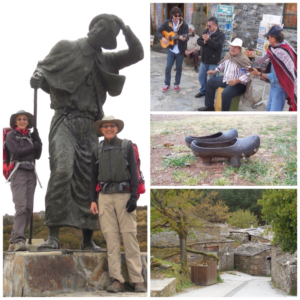 We pause for a quick photo at the Monumento do Peregrino. An impromptu concert draws a crowd one Sunday afternoon. We were discussing these wooden shoes when the owner told us they were called galoshes. As we wind our way down through another village, all we can see are the angles of the roofs. - Crowds Can’t Dampen Spirit: Camino de Santiago